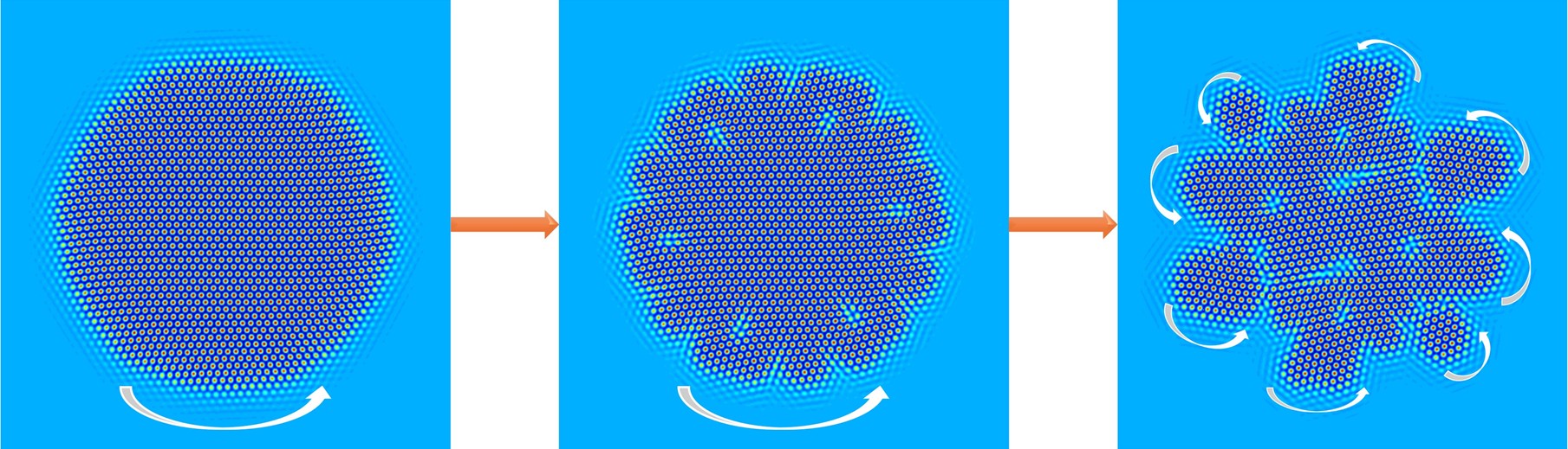 "Wir haben ein dem Prozess zugrundeliegendes fundamentales Naturgesetz entdeckt", erläutert Prof. Dr. Zhi-Feng Huang. "Es beschreibt, wie die Größe der kritischen Bruchstücke und ihre Rotationsgeschwindigkeit zusammenhängen." Und Prof. Dr. Raphael Wittkowski vom DWI – Leibniz-Institut für Interaktive Materialien und von der RWTH Aachen, Koautor der Studie, ergänzt: "Wir konnten auch zeigen, dass Defekte in den Kristallen eine eigene Dynamik zeigen. Die Ausbildung solcher Defekte kann von außen beeinflusst werden. Hierüber können auch die Eigenschaften der Kristalle mit Blick auf Anwendungen gezielt gesteuert werden."